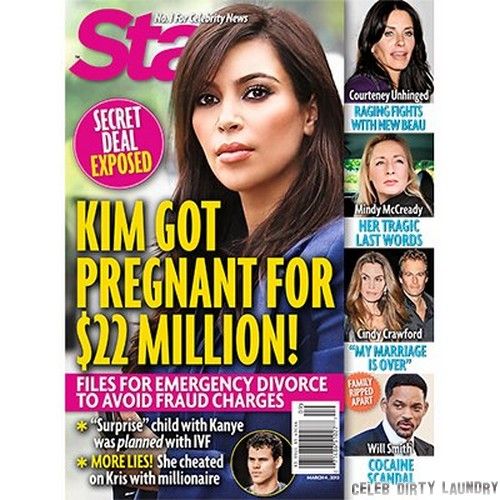 Starleta de reality show apare pe coperta celui mai recent numar al revistei "Star". Conform titlului, Kim a acceptat sa ramana insarcinata contra unei sume de 22 de milioane de dolari intr-o tranzactie strict secreta.
