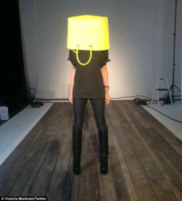 In fotografie, Victoria isi ascunde capul intr-o geanta supradimensionata, galben canar, in timp ce sta in mijlocul unui spatiu care pare un catwalk.