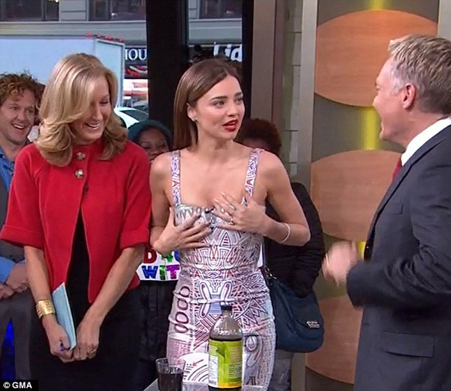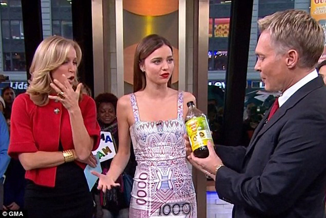 Pentru aparitia TV, Miranda, in varsta de 29 de ani, a ales o rochie cu motive aztece, pana la genunchi.