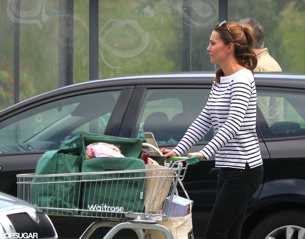 Pentru sesiunea de shopping, Kate a ales o bluza de tip marinar, cu dungi albastre orizontale, la baza gatului, pe care a completat-o cu o pereche de jeansi albastri si balerini lejeri.